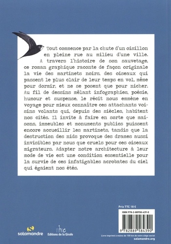 Les martinets à travers une belle histoire. Entre BD et roman graphique, ce livre innovant raconte de façon originale la vie des martinets noirs, des oiseaux qui passent le plus clair de leur temps en vol, même pour dormir, et ne se posent que pour nicher. A travers l'histoire du sauvetage d'un oisillon tombé en pleine rue au milieu d'une ville, l'ouvrage donne des informations très précises sur l'espèce. Au fil de dessins superbes mêlant infographies, poésie, humour et suspense, il met en valeur le travail de nombreux professionnels, bénévoles et associations pour protéger ces oiseaux attachants et faire en sorte que maisons, immeubles et monuments publics de nos villes puissent encore accueillir leurs nids. Une condition essentielle pour la survie de l'espèce. Réalisé en coédition avec les Editions de la Girafe (Musée d'histoire naturelle de La Chaux-de-Fonds, Suisse), ce livre invite à découvrir en profondeur un oiseau extraordinaire qui gagne à être connu et protégé.
