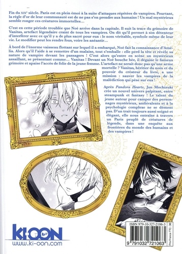 Offre découverte à 3 euros, dans la limite des stocks disponibles. Même fabrication que l'édition courante ! Le mythe du vampire revisité par Jun Mochizuki, reine de la fantasy gothique et auteur de PandoraHearts ! Fin du XIXe siècle. Paris est en plein émoi à la suite d'attaques répétées de vampires. Pourtant, la règle d'or de leur communauté est de ne pas s'en prendre aux humains ! Un mal mystérieux semble ronger ces créatures immortelles... C'est en cette période troublée que Noé arrive dans la capitale. Il suit la trace du grimoire de Vanitas, artefact légendaire craint de tous les vampires. On dit qu'il permet à son détenteur d'interférer avec ce qu'il y a de plus sacré pour eux : le nom véritable, symbole même de leur vie. Le modifier peut les rendre fous, voire les anéantir... A bord de l'énorme vaisseau flottant sur lequel il a embarqué, Noé fait la connaissance d'Amélia. Alors qu'il l'aide à se remettre d'un malaise, tout s'emballe : elle perd la tête et révèle sa nature de vampire devant les passagers ! C'est alors qu'entre en scène un mystérieux assaillant, se présentant comme... Vanitas ! Devant un Noé bouche bée, il dégaine le fameux grimoire et apaise l'accès de folie de la jeune femme. L'artefact ne serait donc pas qu'une arme mortelle ? Vanitas, héritier du nom et du pouvoir du créateur du livre, a une mission : sauver les vampires de la malédiction qui pèse sur eux ! Après PandoraHearts , Jun Mochizuki crée un nouvel univers palpitant, entre steampunk et fantasy ! Le talent du jeune auteur pour camper des personnages mystérieux, ambivalents et à la psychologie complexe ne se dément pas. D'un trait toujours aussi soigné et élégant, elle nous entraîne à travers un Paris peuplé de créatures de légende, dans une enquête aux frontières du monde des humains et des vampires !