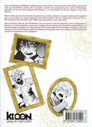 Le mythe des vampires revisité par Jun Mochizuki, reine de la fantasy gothique et autrice de Pandora Hearts ! Cette édition collector comprend : - le tome 10 avec jaquette alternative réversible - un recueil finition cartonnée de 64 pages d'illustrations, strips et croquis 100% inédits Résumé : Sous l'impulsion de Mikhai ? l, l'affrontement entre Noé et Vanitas devient inévitable : furieux de voir que l'archiviste essaie de le pousser à parler de son passé pour sauver Dominique, l'héritier de la lune bleue dépasse les limites... et voit fondre sur lui un vampire tous crocs dehors ! Mais tandis que le jeune humain est prêt à tout, même à abattre son partenaire pour empêcher que ses souvenirs ne soient exposés, Noé retient quant à lui ses coups pour ne pas le tuer... Parviendront-ils à résoudre leur différend avant qu'il ne soit trop tard ? Après Pandora Hearts, Jun Mochizuki crée un nouvel univers palpitant, entre steampunk et fantasy ! Le talent de l'auteur pour camper des personnages mystérieux, ambivalents et à la psychologie complexe ne se dément pas. D'un trait toujours aussi soigné et élégant, elle nous entraîne à travers un Paris peuplé de créatures de légende, dans une enquête aux frontières du monde des humains et des vampires !