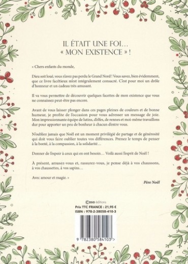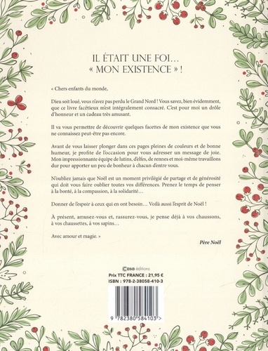 " Chers enfants du monde, Dieu soit loué, vous n'avez pas perdu le Grand Nord ! Vous savez, bien évidemment, que ce livre facétieux m'est intégralement consacré. C'est pour moi un drôle d'honneur et un Cadeau très amusant. Il va vous permettre de découvrir quelques facettes de mon existence que vous ne connaissez peut-être pas encore. Avant de vous laisser plonger dans ces pages pleines de couleurs et de bonne humeur, je profite de l'occasion pour vous adresser un message de joie. Mon impressionnante équipe de lutins, d'elfes, de rennes et moi-même travaillons dur pour apporter un peu de bonheur à chacun d'entre vous. N'oubliez jamais que Noël est un moment privilégié de partage et de générosité qui doit vous faire oublier toutes vos différences. Prenez le temps de penser a la bonté, à la compassion, à la solidarité... Donner de l'espoir à ceux qui en ont besoin... Voilà aussi l'esprit de Noël ! A présent, amusez-vous et, rassurez-vous, je pense déjà à vos chaussons, à vos chaussettes, à vos sapins... Avec amour et magie." Père Noël