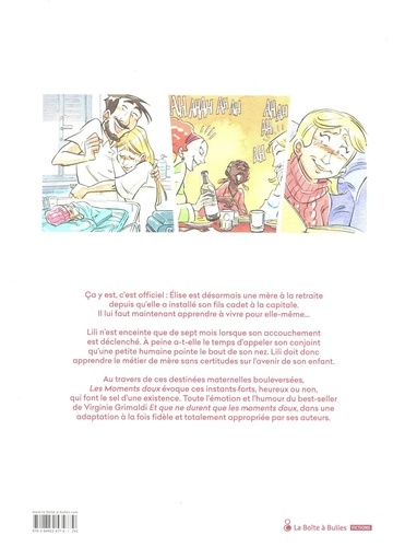 Ca y est, le frigo de Thomas est rempli, le dernier carton déballé... C'est officiel : Elise est devenue une "mère à la retraite" , son fils étant désormais installé à la capitale, et sa fille en Angleterre depuis quelques années. Elle rentre chez elle, à Bordeaux, les bras légers mais le coeur enserré du poids des souvenirs. Que faire de sa vie quand celle-ci a été exclusivement consacrée à ses enfants ? Lili n'est enceinte que depuis sept mois lorsque son accouchement est déclenché. A peine son conjoint a-t-il le temps de la rejoindre qu'une petite humaine toute fragile pointe le bout de son nez. Lili doit donc apprendre le magnifique métier de mère sans certitudes sur l'avenir de son enfant. Dans la maternité, elle croise d'autres parents, d'autres souffrances, d'autres espoirs et découvre qu'avoir un enfant est parfois une aventure bien plus périlleuse qu'on ne le pense... Récits croisés d'une jeune maman en devenir et d'une autre fraichement "mise à la retraite" , Les Moments doux évoque tous ces instants forts qui font une existence. Au rythme des mutations vécues par ces deux femmes se dessine, avec espièglerie et tendresse, la fresque d'une vie heureuse par-delà les soubresauts de l'existence. Toute l'émotion et l'humour du best-seller de Virginie Grimaldi, Et que ne durent que les moments doux, se retrouvent intacts dans cette adaptation fidèle au livre, et en même temps totalement appropriée par les auteurs...