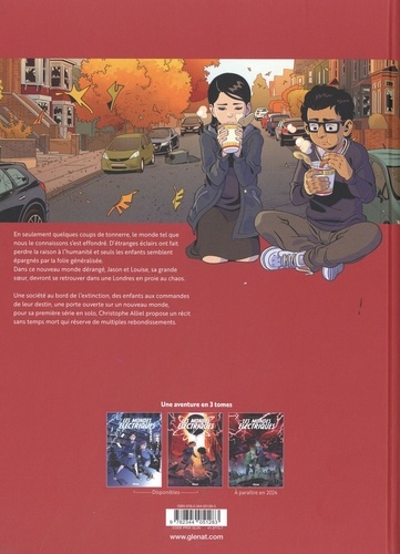 Il y a toujours un espoir au milieu du chaos. Le chaos continue de régner à Londres où d'étranges éclairs ont fait perdre la raison aux adultes. Seuls les enfants semblent avoir été épargnés par la folie généralisée. Bientôt, après une violente explosion, une effrayante boule d'énergie se forme dans le ciel ! Face à cette force surnaturelle, Jason et sa bande d'amis s'organisent tant bien que mal pour survivre et se ravitailler au sein d'un immeuble. Sortir de leur Q. G. s'avère encore plus dangereux quand des créatures à l'allure sinistre commencent à rôder. Ces monstres manipulent-ils les adultes ? A l'abri, Jason s'inquiète en pensant à Louise, sa soeur. Lors de l'explosion, il n'était pas à ses côtés. Elle est sûrement seule et apeurée dehors. Envers et contre tout, il décide de partir à sa recherche. Malgré le danger, il est hors de question de l'abandonner ! C'est le début d'une aventure électrique où l'angoisse monte d'un cran au milieu de la ville ravagée. Au même moment, Louise se réveille sous les débris... Une Société au bord de l'extinction, des enfants aux commandes de leur destin, la capitale anglaise sombrant dans l'anarchie et la violence, une porte ouverte sur un nouveau monde... Pour sa première série en solo Christophe Alliel propose un récit sans temps mort, avec de multiples rebondissements.