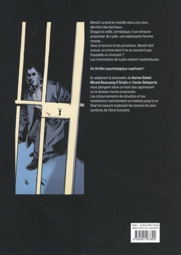 Séquestré dans une cave, le commandant Benoît Lorand est à la merci de Lydia, belle femme au comportement hiératique et tortionnaire. Il lui faudra fouiller dans son passé pour comprendre les motivations de sa geôlière... Une femme rousse, plutôt charmante. Oui, il se souvient. Un peu... Il l'a suivie chez elle... Ils ont partagé un verre, il l'a prise dans ses bras... Ensuite, c'est le trou noir. Quand le commandant Benoît Lorand se réveille dans cette cave, derrière ces barreaux, il comprend que sa vie vient de basculer dans l'horreur. Lydia le retient prisonnier. L'observe, le provoque, lui fait mal. Rituel barbare, vengeance, dessein meurtrier, pure folie ? Une seule certitude : un compte à rebours terrifiant s'est déclenché. Combien de temps résistera-t-il à ces morsures de l'ombre, infligées par cette femme assoiffée de vengeance ? Un récit noir magistral et tendu à l'extrême, où les auteurs nous entraînent dans un huis clos glaçant au coeur de la folie d'après le bestseller multiprimé de Karine Giébel.