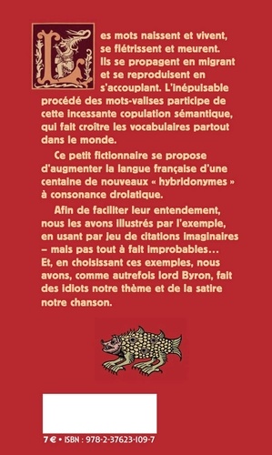 Ce petit glossaire se propose d'augmenter la langue française d'une centaine de nouveaux "hybridonymes" à consonance drolatique - tels que "finançailles" , "calomnivore" , "déconomiste" , filousophe" , "pissenligne" , "sarkopithèque" , et caetera. Afin de faciliter leur entendement, nous les avons illustrés par l'exemple, en usant par jeu de citations inventées, certaines étant attribuées à des plumitifs bien réels et d'autres à des auteurs potentiels ou fictifs. En choisissant ces exemples, nous avons tout naturellement, comme autrefois lord Byron, fait des idiots notre thème et de la satire notre chanson - ou, plutôt, notre petit fictionnaire de poche, pour user d'un mot-valise de circonstance.