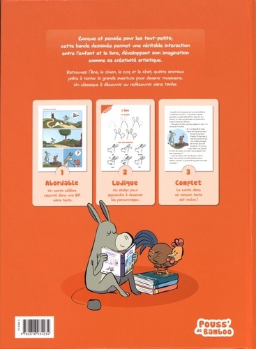 Conçue et pensée pour les tout-petits, cette bande dessinée permet une véritable interaction entre l'enfant et le livre, développant son imagination comme sa créativité artistique. Retrouvez l'âne, le chien, le coq et le chat, quatre animaux prêts à tenter la grande aventure pour devenir musiciens. Un classique è découvrir ou redécouvrir sans tarder ! 1 : Abordable. Un conte célèbre raconté dans une BD sans texte. 2 : Ludique. Un atelier pour apprendre à dessiner les personnages. 3 : Complet. Le conte dans sa version texte est inclus !