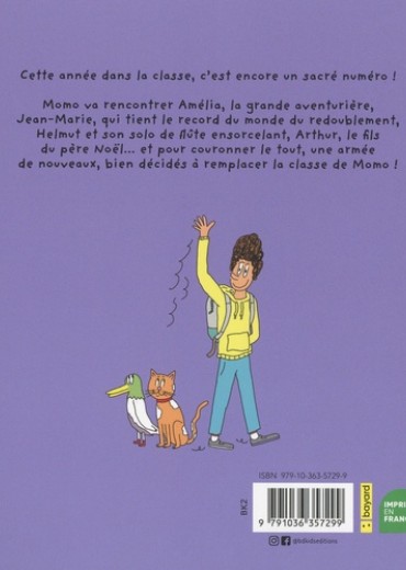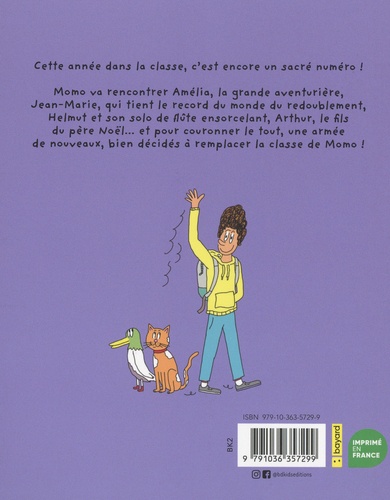 Cette année dans la classe, c'est encore un sacré numéro ! Momo va rencontrer Amélia la grande aventurière, Jean-Marie, qui tient le record du monde du redoublement, Médor, un chien vraiment trop sage, Marcus, la puce championne de saut en longueur, Julien, un jeune garçon plus pourri que gâté, Olivier le hêtre, Helmut et son solo de flute ensorcelant, Cindy l'étoile filante, Arthur le fils du père Noël... Et le clou du spectacle ? Une armée de nouveaux, bien décidés à remplacer la classe de Momo !
