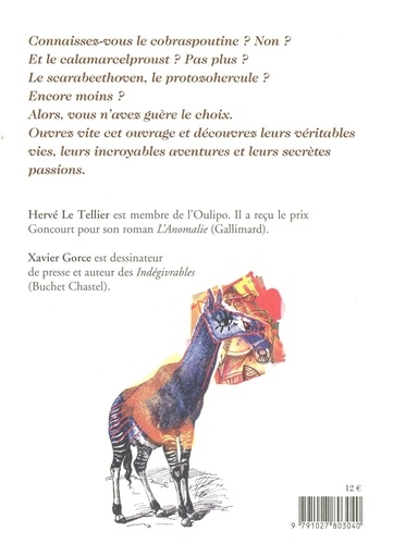 Connaissez-vous le homarylinmonroe ? La mureinedangleterre ? Le scarabeethoven ? Non ? Hervé Le Tellier et Xavier Gorce ouvrent les portes de leur zoo oulipien et vous invitent à découvrir les vies imaginaires d'animaux (anonymes) et d'hommes (célèbres). - Les Opossums célèbres rassemble quarante textes construits à partir des mots-valises d'Hervé Le Tellier et des collages de Xavier Gorce. - Au fil des pages, vous croiserez le calmarcelproust à la recherche du thon perdu, la coquille Saint-Jacquebrel occupée à faire des perles de pluie ou le phacosherlockholmes s'exclamant : " Elémentaire, chihuawatson ! "