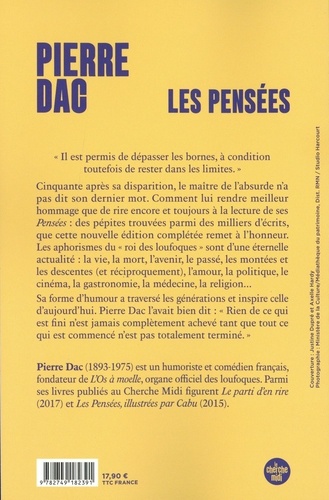 Cinquante après sa disparition, le maître de l'absurde n'a pas dit son dernier mot. Comment lui rendre meilleur hommage que de rire encore et toujours à la lecture de ses Pensées : des pépites trouvées parmi des milliers d'écrits, que cette nouvelle édition complétée remet à l'honneur. Les aphorismes du " roi des loufoques " sont d'une éternelle actualité : la vie, la mort, l'avenir, le passé, les montées et les descentes (et réciproquement), l'amour, la politique, le cinéma, la gastronomie, la médecine, la religion... Sa forme d'humour a traversé les générations et inspire celle d'aujourd'hui. Pierre Dac l'avait bien dit : " Rien de ce qui est fini n'est jamais complètement achevé tant que tout ce qui est commencé n'est pas totalement terminé. "