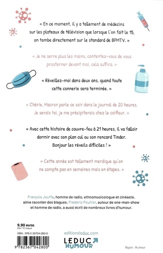 "En ce moment, il y a tellement de médecins sur les plateaux de télévision que lorsque l'on fait le 15, on tombe directement sur le standard de BFMTV." "Je ne serre plus les mains, contentez-vous de vous prosterner devant moi, cela suffira." "Réveillez-moi dans deux ans, quand toute cette connerie sera terminée." "Chérie, Macron parle ce soir dans le journal de 20 heures. Je serais toi, je me précipiterais chez le coiffeur." "Avec cette histoire de couvre-feu à 21 heures, il va falloir dormir avec son plan cul ou son rencard Tinder. Bonjour les réveils difficiles ! " "Cette année est tellement merdique qu'on ne compte pas en semaines mais en étapes."