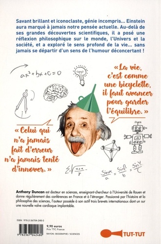Scientifique de génie, Einstein aura marqué à jamais notre pensée actuelle. Au-delà de ses grandes découvertes scientifiques, il a posé une réflexion philosophique sur le monde, l'univers et la société, et a exploré le sens profond de la vie... sans jamais se départir d'un sens de l'humour déconcertant ! "La seule chose absolue dans un monde comme le nôtre... c'est l'humour". "La logique vous mènera de A à B. L'imagination vous mènera partout". "Celui qui n'a jamais fait d'erreur n'a jamais tenté d'innover". "La vie, c'est comme une bicyclette, il faut avancer pour garder l'équilibre".