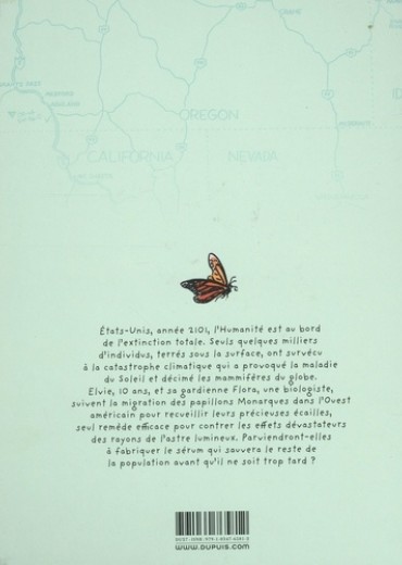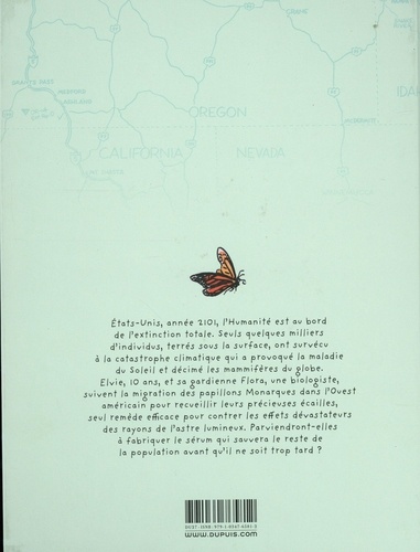 Etats-Unis, année 2101, l'Humanité est au bord de l'extinction totale. Seuls guelgues milliers d'individus, terrés sous la surface, ont survécu à la catastrophe climatigue qui a provoqué la maladie du Soleil et décimé les mammifères du globe. Elvie, 10 ans, et sa gardienne Flora, une biologiste, suivent la migration des papillons Monarques dans l'Ouest américain pour recueillir leurs précieuses écailles, seul remède efficace pour contrer les effets dévastateurs des rayons de l'astre lumineux. Parviendront-elles à fabriquer le sérum qui sauvera le reste de la population avant qu'il ne soit trop tard ?