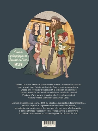 Lucas et Jade ont hérité du pouvoir de leur mère : traverser les tableaux pour atterrir dans l'atelier de l'artiste. Quel pouvoir extraordinaire ! Encore faut-il pouvoir s'en servir. Et la tentation est immense surtout lorsqu'ils sont en visite scolaire au musée du Louvre ! Profitant d'une alarme providentielle, les enfants sautent dans le célèbre tableau de Léonard de Vinci. Les voici transportés en 1506 au Clos Lucé aux pieds de Lisa Gherardini... Passées la surprise et la présentation avec le célèbre peintre, les enfants vont devoir sauver l'oeuvre que Léonard voue à la destruction. Y parviendront-ils ? Partez avec nos jeunes héros à la découverte du célèbre tableau de Mona Lisa ainsi que de l'univers incroyable et du génie de Léonard de Vinci.