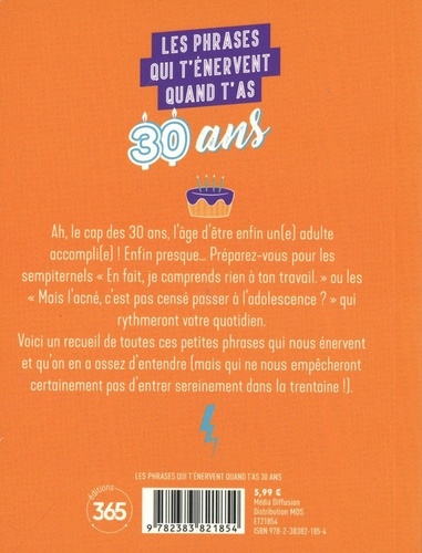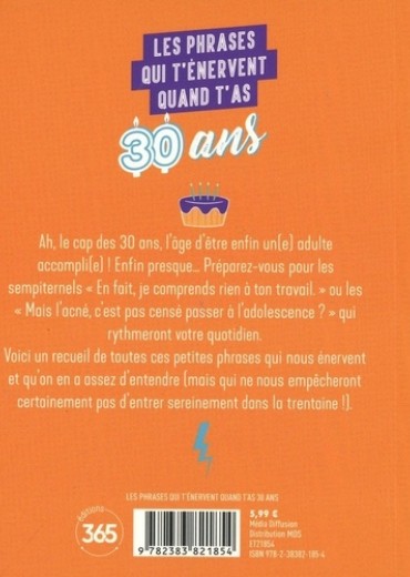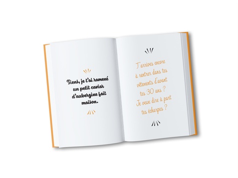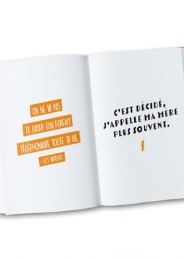 Le cadeau parfait à offrir à ses ami. e. s ou à soi-même : un recueil de toutes ces petites phrases qui nous énervent et qu'on en a assez d'entendre (mais qui ne nous empêcheront certainement pas d'entrer sereinement dans la trentaine ! ). 208 pages de citations et d'expressions pleines d'humour "Ca te dit d'aller à Deauville le week-end prochain ? " "C'est décidé, je deviens végan". "Allez, je te sers un petit verre, faut soigner le mal par le mal ! " "C'est décidé, j'achète moins, mais mieux". "Comment un mec comme toi peut être encore célibataire ? " "Putain, 112 messages Whatsapp en 2 heures... " "C'est décidé, je me mets au yoga". "Si tu restes encore plus longtemps dans cette boîte, tu vas finir par prendre racine". "Si j'étais toi, je profiterais de ma jeunesse pour voyager ! " Format 10 x 13 cm / 208 pages