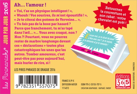 Ah l’amour ! «Toi, t’as un physique intelligent !». «Waouh! Vos sourires, ils m’ont époustiflé !», «Je te citerai des poèmes de Verveine». «Tu fais pas de boxe par hasard ? Parce que franchement, tu m’as tapé dans l’oeil». Vous avez craqué, non ? Non ?! Pourtant vous ne pourrez rester de marbre longtemps devant ces «déclarations» toutes plus catastrophiques les unes que les autres. Tomber amoureux, c’est peut-être pas pour aujourd’hui, mais hurler de rire, si !