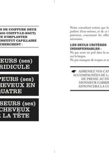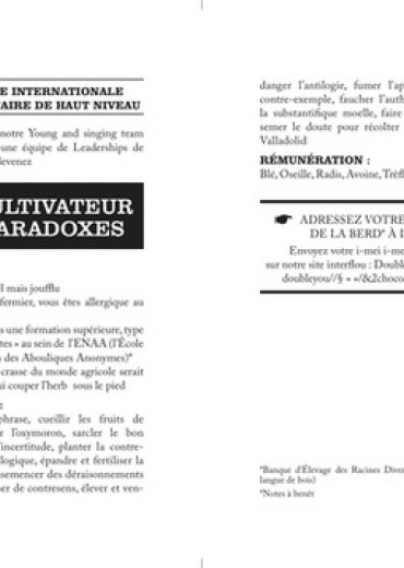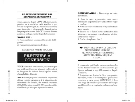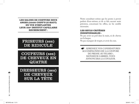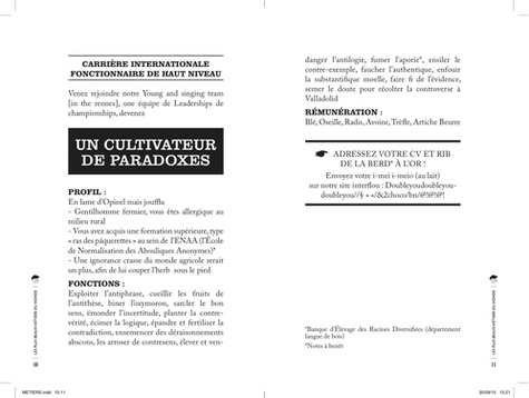 Crêpeur de chignon. Enfonceur de portes ouvertes. Avaleur de couleuvres. Cireur de pompes. Prêteur à confusion. Existe-t-il un métier idéal ? Est-il possible d'imaginer exercer un job en or ? C'est sans doute en se posant ce genre de questions que nos deux auteurs amoureux des mots ont imaginé ce petit livre étonnant et poétique qui distille au fil des pages des annonces pour des métiers surprenants, directement sortis de leur imagination. Ces offres d'emploi insolites nous donnent l'occasion de rêver, de nous évader, de sourire... Dans cet inventaire à la Prévert improbable et charmant, vous pourrez postuler pour devenir tour à tour bourreur de mou, friseur de ridicule, cultivateur de paradoxes, découvreur de pot aux roses ou bien simple taquineur de goujons. Amoureux de bons mots, débutants ou expérimentés, ruez-vous sur ces annonces pas comme les autres ! Nul doute que les candidats seront nombreux à postuler à ces emplois qui - chacun à leur manière - nous font croire à un monde du travail meilleur...