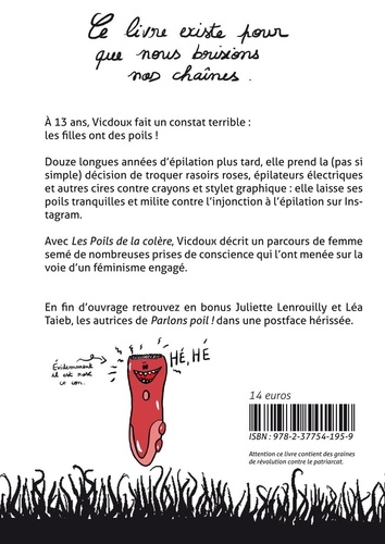A 13 ans, Vicdoux fait un constat terrible : les filles ont des poils ! Douze longues années d'épilation plus tard, elle prend la (pas si simple) décision de troquer rasoirs roses, épilateurs électriques et autres cires contre crayons et stylet graphique : elle laisse ses poils tranquilles et milite contre l'injonction à l'épilation sur Instagram. Avec Les Poils de la colère, Vicdoux décrit un parcours de femme semé de nombreuses prises de conscience qui l'ont menée sur la voie d'un féminisme engagé. En fin d'ouvrage retrouvez en bonus Juliette Lenrouilly et Léa Taieb, les autrices de Parlons poil ! dans une postface hérissée.