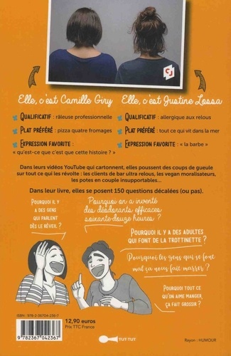 Elle, c'est Camille Giry : qualificatif : râleuse professionnelle ; plat préféré : pissa quatre fromages ; expression favorite : "qu'est-ce que c'est que cette histoire ? " Elle, c'est Justine Lossa : qualificatif : allergique aux relous ; plat préféré : tout ce qui vit dans la mer ; expression favorite : "la barbe". Dans leurs vidéos YouTube qui cartonnent, elles poussent des coups de gueule sur tout ce qui les révolte : les clients de bar ultra relous, les vegan moralisateurs, les potes en couple insupportables... Dans leur livre, elles se posent 150 questions décalées (ou pas). Pourquoi il y a des gens qui parlent dès le réveil ? Pourquoi on a inventé des déodorants efficaces soixante-douze heures ? Pourquoi il y a des adultes qui font de la trottinette ? Pourquoi les gens qui se font mal ça vous fait marrer ? Pourquoi tout ce qu'on aime manger, ça fait grossir ?