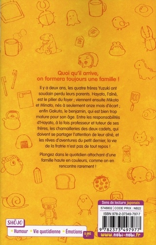 Quoi qu'il arrive, on formera toujours une famille ! Il y a deux ans, les quatre frères Yuzuki ont soudain perdu leurs parents. Hayato, l'aîné, est le pilier du foyer ; viennent ensuite Mikoto et Minato, nés à seulement onze mois d'écart ; enfin Gakuto, le benjamin, qui est bien trop mature pour son âge. Entre les responsabilités d'Hayato, à la fois professeur et tuteur de ses frères, les chamailleries des deux cadets, qui doivent se partager l'attention de leur aîné, et les rêves d'aventures du petit dernier, la vie de la fratrie n'est pas de tout repos ! Plongez dans le quotidien attachant d'une famille haute en couleurs, comme on en rencontre rarement !