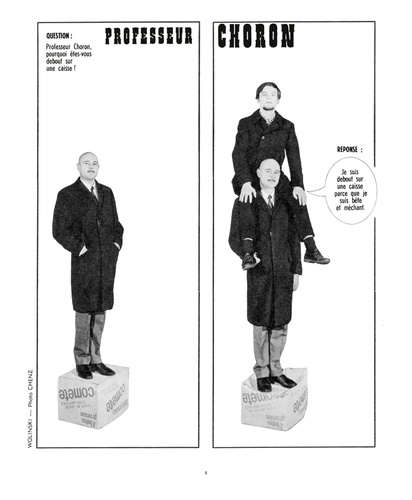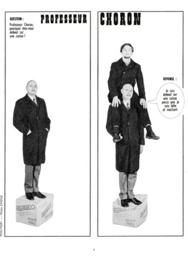 Dans les années 60/70, une bande d'iconoclastes à l'humour ravageur révolutionna la presse avec un magazine devenu mythique : Hara-Kiri, journal bête et méchant. Le roman photo " Professeur Choron " : réponse à tout s'imposa rapidement comme l'un des rendez-vous incontournables de ce mensuel satirique. Georges Wolinski en scénarisa plus de 500 pages jusqu'en 1982, laissant libre cours à l'outrance et à la provocation typique de l'esprit d' Hara- Kiri. "La société des années soixante nous mettait mal à l'aise. [...] On étouffait sous les tabous" disait Choron. Ce sont les collaborateurs du journal eux-mêmes qui jouaient les acteurs : le Professeur Choron bien sur, mais aussi Reiser, Wolinski, Gébé ou Coluche auxquels s'ajoutaient les complices d'un soir, les copains, des stars de passage... et les Hara-Kiri's girls, "des filles à poil, parce que c'est joli". Un feu d'artifice délirant et jouissif d'impudeur, d'irrespect et d'irrévérence.
