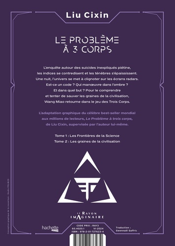 L'enquête autour des suicides inexpliqués piétine, les indices se contredisent et les ténèbres s'épaississent. Une nuit, l'univers se met à clignoter sur les écrans radars. Est-ce un code ? Qui manoeuvre dans l'ombre ? Et dans quel but ? Pour le comprendre et tenter de sauver les graines de la civilisation, Wang Miao retourne dans le jeu des Trois Corps. L'adaptation graphique du célèbre best-seller mondial aux millions de lecteurs, Le Problème à trois corps, de Liu Cixin, supervisée par l'auteur lui-même. Tome 1 : Les Frontières de la Science Tome 2 : Les graines de la civilisation.