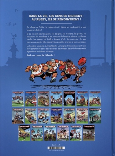 Au village de Paillar, le rugby est roi ! Même les ronds-points y sont ovales, c'est dire ! Et ce ne sont pas les gnons, les beignes, les marrons, les poires, les bouchons, les mandales et les tampons de l'équipe adverse qui feront reculer les joueurs du Paillar Athlétic Club. Au contraire, ils sont convaincus que les filles adorent leurs oreilles broyées et leur nez cassé. La Couâne, Loupiote, L'Anesthésiste, La Teigne et Bourrichon vont vous faire pénétrer au coeur des vestiaires, des mêlées, des club-houses et des légendaires troisièmes mi-temps... Bref, au coeur de l'Ovalie