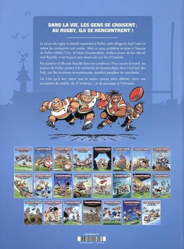 DANS LA VIE, LES GENS SE CROISENT ; AU RUGBY, ILS SE RENCONTRENT ! La saison de rugby va bientôt reprendre à Paillar, petit village du Sud-Ouest où même les rond.points sont ovales. Mois un gros problème se pose à l'équipe du Radar Athlétic Club : le fidjien Sossatoulépla, meilleur joueur de leur éternel rival Ripaille, n'est toujours pas revenu de son îlot d'Ovolialo. Pas question d'affronter Ripaille dons ces conditions ! Pour sauver le match, les joueurs de Paillar partent à la recherche de Sossotoulépla dans l'archipel des Fidji, ces les lointaines et mystérieuses, autrefois peuplées de cannibales... n'est qu'a leur retour que la saison pourra enfin débuter, dans une succession de matchs, de 3e mi-temps... et de passages à l'infirmerie.