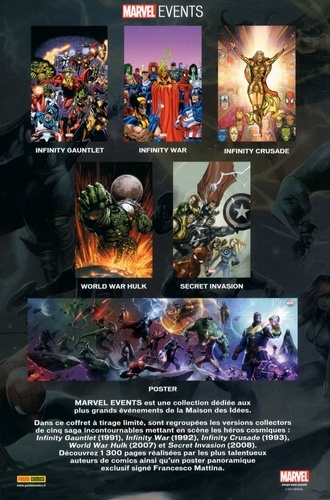 Marvel Events est une collection dédiée aux plus grands événements de la Maison des Idées. Dans ce coffret à tirage limité, sont regroupées les versions collectors de cinq saga incontournables mettant en scène les héros cosmiques : Infinity Gauntlet (1991), Infinity War (1992), Infinity Crusade (1993), World War Hulk (2007) et Secret Invasion (2008). Découvrez 1 300 pages réalisées par les plus talentueux auteurs de comics ainsi qu'un poster panoramique exclusif signé Francesco Mattina.