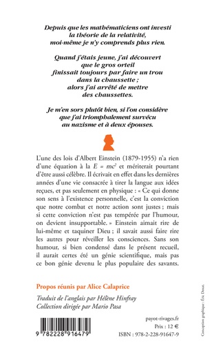 L'une des lois d'Albert Einstein (1879-1955) n'a rien d'une équation à la E = mc2 et mériterait pourtant d'être aussi célèbre. Il écrivait en effet dans les dernières années d'une vie consacrée à tirer la langue aux idées reçues, et pas seulement en physique : "Ce qui donne son sens à l'existence personnelle, c'est la conviction que notre combat et notre action sont justes ; mais si cette conviction n'est pas tempérée par l'humour, on devient insupportable." Einstein aimait rire de lui-même et taquiner Dieu ; il savait aussi faire rire les autres pour réveiller les consciences. Sans son humour, si bien condensé dans le présent recueil, il aurait certes été un génie scientifique, mais pas ce bon génie devenu le plus populaire des savants.