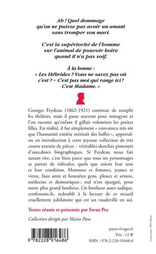 Georges Feydeau (1862-1921) continue de remplir les théâtres, mais il passe souvent pour misogyne et l'on raconte qu'enfant il giflait volontiers les petites filles. En réalité, il fut simplement "convaincu très tôt que l'humanité entière méritait des baffes", apprend-on en introduction à cette joyeuse collection de très courts extraits de pièces - véritables sketches pimentés d'anecdotes biographiques. Si Feydeau nous fait autant rire, c'est bien parce que tous ses personnages se parent de ridicules, quels que soient leur sexe et leur condition. Hommes et femmes, jeunes et vieux, faux amis et honnêtes gens, ploucs et aristos, médecins et domestiques : nul n'est épargné, pour notre plus grand bonheur. Un bonheur assez sadique, confessons-le, redoublé à la lecture de ce recueil cruellement jubilatoire qui est un vaudeville en soi.