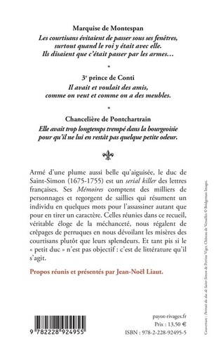 Marquise de Montespan : Les courtisans évitaient de passer sous ses fenêtres, surtout quand le roi y était avec elle. Ils disaient que c'était passer par les armes... 3e prince de Conti : Il avait et voulait des amis, comme on veut et comme on a des meubles. Chancelière de Pontchartrain : Elle avait trop longtemps trempé dans la bourgeoisie pour qu'il ne lui en restât pas quelque petite odeur.