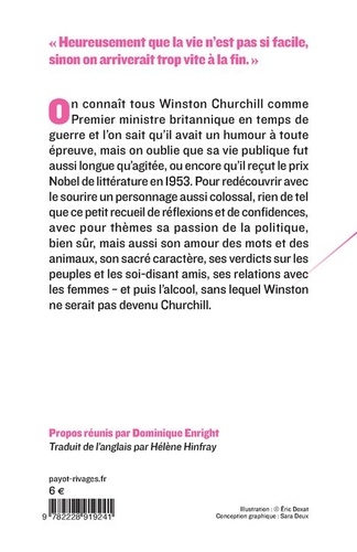 On connaît tous Winston Churchill comme Premier ministre britannique en temps de guerre et l'on sait qu'il avait un humour à toute épreuve, mais on oublie que sa vie publique fut aussi longue qu'agitée, ou encore qu'il reçut le prix Nobel de littérature en 1953. Pour redécouvrir avec le sourire un personnage aussi colossal, rien de tel que ce petit recueil de réflexions et de confidences, avec pour thèmes sa passion de la politique, bien sûr, mais aussi son amour des mots et des animaux, son sacré caractère, ses verdicts sur les peuples et les soi-disant amis, ses relations avec les femmes - et puis l'alcool, sans lequel Winston ne serait pas devenu Churchill.