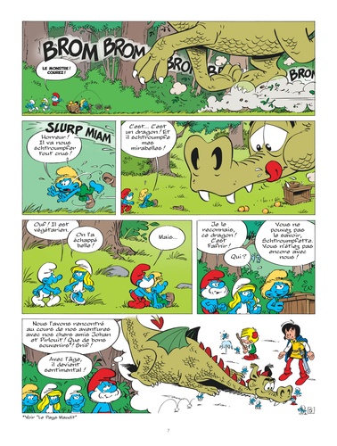 Le Schtroumpf Costaud, qui fait de l'aviron sur le lac du barrage, aperçoit dans la brume la silhouette d'un monstre. Est-ce une hallucination ? Non ! Les Schtroumpfs rencontrent bientôt cette créature, un dragon, qui est d'ailleurs une de leurs vieilles connaissances. L'encombrant dragon va les entraîner jusqu'au lointain château de Jolival où ils l'aideront à secourir son maître, le fantasque Baron Florimond...
