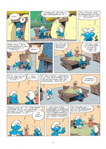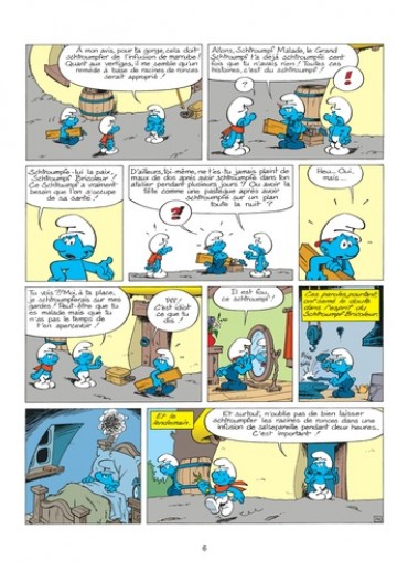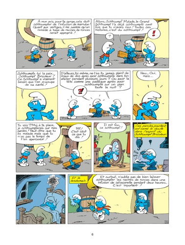 Considérant que tous ses congénères sont de faux bien-portants, un Schtroumpf s'improvisera médecin. Un hôpital sera dès lors construit qui, grâce aux bons soins de la prévenante Schtroumpfette, se remplira vite des cas les plus farfelus. Mais, l'initiative suscitera des émules et une belle pagaille dans le village.