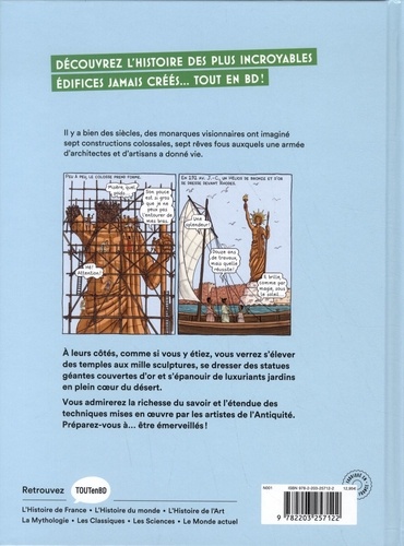 Tout le monde a entendu parler des pyramides d'Egypte du phare d'Alexandrie des jardins de Babylone du Colosse de Rhodes... Cette bande dessinée nous raconte la genèse de leur création et les secrets de leur construction mais aussi les raisons de leur disparition. Un voyage à travers les époques et les civilisations à la découverte des monarques visionnaires et des milliers d'artisans qui ont façonné ces chefs-d'oeuvre de l'histoire humaine. L'expertise et la science du récit de Viviane Koenig se conjuguent à la précision du dessin d'Emmanuel Olivier pour donner naissance à une bande dessinée... qui fait merveille !