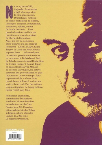 Né en 1929 au Chili, Alejandro Jodorowsky a déjà vécu sept vies. Et bien plus encore. Dramaturge, metteur en scène, réalisateur de cinéma, tarologue, essayiste, compositeur, romancier, peintre, auteur de bande dessinée... il est peu de domaines qu'il n'a pas investi avec un souci constant de liberté et d'invention. Avec, à la clé, de nombreux chefs-d'oeuvre qui ont marqué les esprits : L'Incal, El Topo, Santa Sangre, La Caste des Méta-Barons, le projet Dune... Jodorowsky est un créateur passionnant toujours en mouvement. De Moebius à Dali, de John Lennon à Arnaud Desjardins, de Dennis Hopper à Roland Topor en passant par Marylin Manson ou Leonora Carrington, il a côtoyé certaines des personnalités les plus importantes de notre temps. Pour la première fois, un beau livre, très richement illustré, revient sur la vie et l'oeuvre de l'un des artistes les plus singuliers de la pop culture. Happy rebirth day, Jodo.