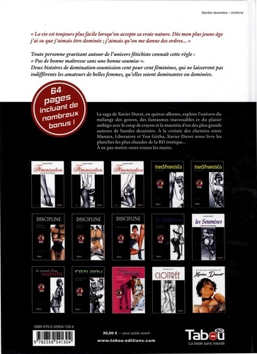 La saga de Xavier Duvet, en quinze albums, explore l'univers du mélange des genres, des fantasmes inavouables et du plaisir ambigu avec le coup de crayon et la maestria d'un des plus grands auteurs de bandes dessinées. A la croisée des chemins entre Manara, Liberatore et Von Götha, Xavier Duvet nous livre les planches les plus chaudes de la BD érotique... A ne pas mettre entre toutes les mains.