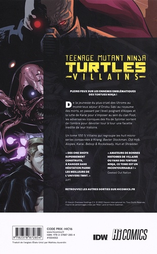 Pleins feux sur les ennemis emblématiques des Tortues Ninja ! De la jeunesse du plus cruel des Utroms au mystérieux séjour d'Oroku Saki au royaume des morts, en passant par l'éveil poignant d'Alopex et la lutte de Karai pour s'imposer au sein du clan Foot, les adversaires iconiques des fils de Splinter sortent de l'ombre pour dévoiler tour à tour une facette inédite de leur histoire. Un tome 100 % Villains qui regroupe les huit micro-series consacrées à Krang, Baxter Stockman, Old Hob, Alopex, Karai, Bebop & Rocksteady, Hun et Shredder. " Amateurs de bonnes histoires de villains ou fans des Tortues Ninja, ce tome est un incontournable ! " Geeked Out Nation " Des one shots superbement construits, à ranger sans hésitation parmi les meilleurs de l'univers TMNT. " AIPT
