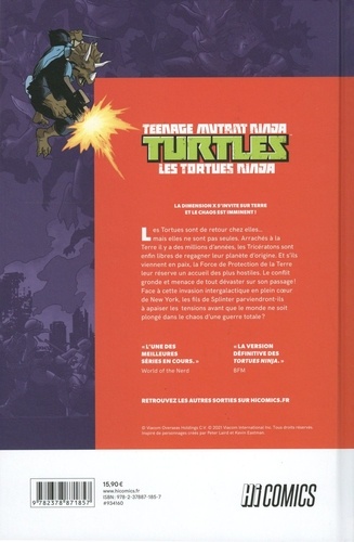 La dimension X s'invite sur Terre et le chaos est imminent ! Les Tortues sont de retour chez elles... mais elles ne sont pas seules. Arrachés à la Terre il y a des milliers d'années, les Tricératons sont enfin libres de regagner leur planète-mère. Et s'ils viennent en paix, la Force de Protection de la Terre leur réserve un accueil des plus hostiles. Le conflit gronde et menace de tout dévaster sur son passage... Face à cette invasion intergalactique en plein coeur de New York, les fils de Splinter parviendront-ils à apaiser les tensions avant que le monde ne soit plongé dans le chaos d'une guerre totale ? " L'une des meilleures séries en cours. " World of the Nerd "La version définitive des Tortues Ninja. " BFM " Si vous ne lisez pas encore Les Tortues Ninja, vous ne vous rendez clairement pas service. " Outright Geekery