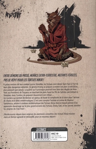 La meilleure histoire de la série phénomène de la Pop-Culture ! Reprenant les fondements de l'histoire des personnages cultes des années 1980, Kevin Eastman et Tom Waltz nous embarquent dans les bas-fonds et égouts de Manhattan, aux côtés de quatre Tortues mutantes bien connues, d'un rat géant et du terrible Shredder. Leonardo, Raphael, Michelangelo et Donatello ont commencé leurs aventures dans un laboratoire avant de devenir les héros que l'on connaît, destinés à déjouer les innombrables menaces qui pèsent sur le monde. Représentant bien plus que des figures bienveillantes, impossible de ne pas s'attacher à ces reptiles pleins d'humanité et à l'univers complexe dans lequel ils évoluent, de New-York à Northampton en passant par les confins de l'espace. (Re)découvrez depuis leurs origines, les aventures complètes des Tortues Ninja réunies dans un format agrandi et retravaillé, pour un nouveau départ ! - Format inédit : Intégra et gaugrage multiniveaux, avec plus de 400 pages d'aventures Tortues Ninja. - Ce tome 2 comprend les issues #13-20 de la série ongoing (les chapitres 13 à 16 des Tortues Ninja tome 0 : Nouveau Départ ; le tome 1 des Tortues Ninja : La Guerre de Krang) ; les micro-séries dédiées à Casey Jones, April, le Fugitoïde, Krang, Baxter Stockman ; et les issues #1-4 de The secret history of the Foot Clan (L'Histoire secrète du Clan Foot).