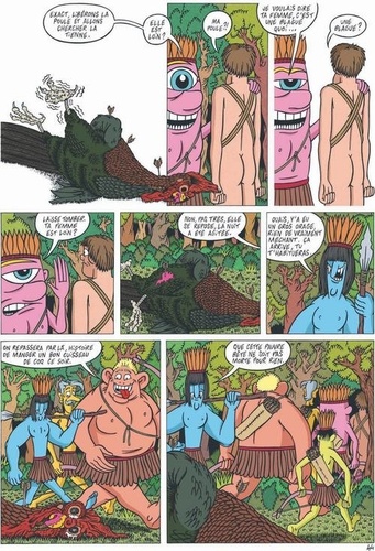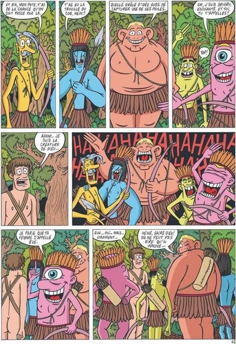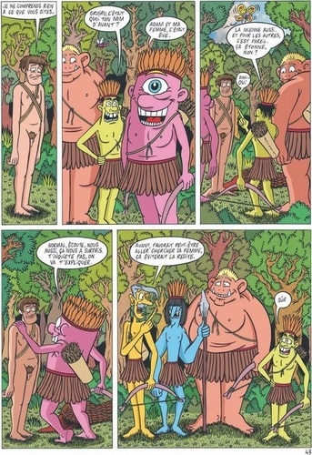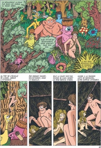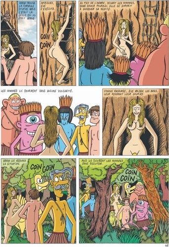 Eve dormait encore. Délicatement, Adam la réveilla. Elle lui sourit mais son sourire se figea devant la mine défaite d'Adam. Hagard, il lui demanda juste de descendre, qu'une surprise l'attendait. Adam trouva la formule stupide mais c'était la seule qui lui était venue. Intriguée, Eve s'exécuta. Au pied de l'arbre, devant les hommes, sans savoir pourquoi, elle se surprit à masquer sa nudité. Les hommes lui sourirent sans aucune vulgarité. Rassurée, Eve baissa les bras, leur rendant leur sourire...