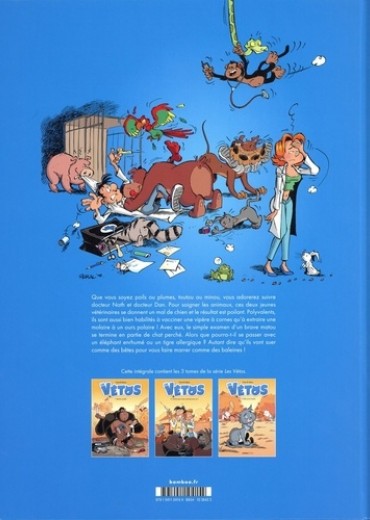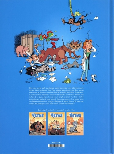 Que vous soyez poils ou plumes, toutou ou minou, vous adorerez suivre ces deux jeunes vétérinaires, docteur Nath et docteur Dan. Sympathiques, dynamiques et surtout rigolos, ils sont polyvalents : aussi bien habilités à vacciner une vipère à cornes qu'à extraire une molaire à un ours polaire ! Avec eux, le simple examen d'un brave matou se termine en partie de chat perché, alors que pourra-t-il se passer avec un éléphant enrhumé ou un tigre allergique ? Inclus un cahier pédagogique en partenariat avec la SPA. 1 intégrale achetée = 10 repas pour un pensionnaire de la SPA