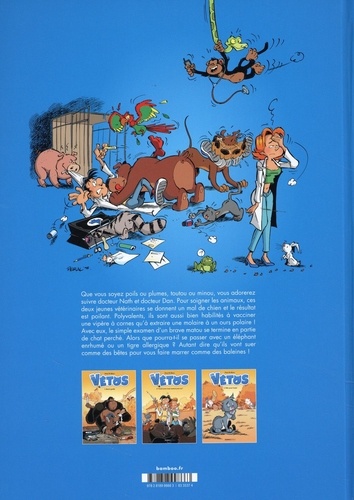 Que vous soyez poils ou plumes, toutou ou minou, vous adorerez suivre docteur Nath et docteur Dan. Pour soigner les animaux, ces deux jeunes vétérinaires se donnent un mal de chien et le résultat est poilant. Polyvalents, ils sont aussi bien habilités à vacciner une vipère à cornes qu'a extraire une Avec eux, le simple examen d''un brave molaire polaire matou se termine en partie de chat perché. Alors que pourra-t-il se passer avec un éléphant enrhumé ou un tigre allergique ? Autant dire qu'ils vont suer comme des bettes pour vous faire marrer comme des baleines !