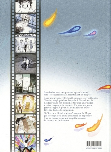 Dans une grande ville futuriste et grouillante, Charlie, un jeune homme plein de bonne volonté, travaille pour Recycle & Ternel, une société dont le slogan est " Vous mourez, nous recyclons ". Charlie passe donc son temps à répondre au téléphone à des familles qui veulent savoir en quoi pourrait être transformé leur cher défunt. Un jour, un gamin l'appelle pour lui demander ce qu'est devenue l'âme de sa maman. Incapable de répondre, Charlie va enquêter et découvrir que l'âme des morts est réinstallée dans leur corps idéalisé avant leur réincarnation... Kid Toussaint et Aurélie Guarino nous livrent une fable tout en sensibilité sur la mort, la vie après la mort et l'amour à travers le temps.