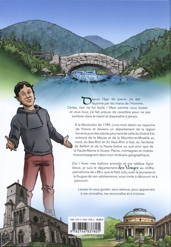 Depuis l'âge de pierre, j'ai été façonné par les mains de l'Homme. Certes, rien ne fut facile l Mais comme vous toutes et vous tous, j'ai fait preuve de caractère pour ne pas sombrer dans le néant et disparaître à jamais. A la Révolution de 1789, j'unis mon destin au royaume de France et deviens un département de la région lorraine puis des siècles plus tard de celle du Grand-Est, entouré de la Meuse et de la Meurthe-et-Moselle au nord, du Bas-Rhin et du Haut-Rhin à l'est, du Territoire de Belfort et de la Haute-Saône au sud ainsi que de la Haute-Marne à l'ouest. Plaine, montagnes et rivières m'accompagnent dans mon itinéraire géographique. Oui ! Avec mes ballons arrondis et ma célèbre ligne bleue, je suis le département des Vosges au chiffre palindrome de "88", que le Petit Jolo, avec la jeunesse et la fougue de son adolescence, vous invite à découvrir et à parcourir. Laissez-le vous guider, sans retenue, pour apprendre à me connaître, me reconnaître et à m'aimer.