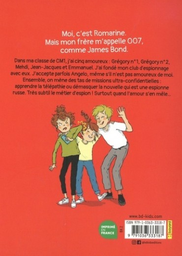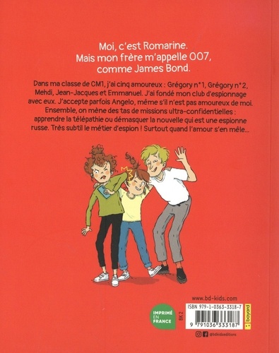 Trois histoires de l'espionne dans une bande-dessinée ! L'espionne à votre service Romarine a beaucoup à faire avec les histoires de coeur de son frère et sa soeur : Noël a deux amoureuses, et Boubouillasse, elle, n'a personne. Grâce à ses techniques d'espionnage, Romarine décide de les aider... à leur insu ! L'espionne cartonne L'espionne cartonne : Alors que tout le monde veut s'acheter un téléphone portable, Romarine décide d'apprendre la télépathie qu'elle veut mettre au service de son club. L'espionne s'énerve Romarine est très énervée : son père ne la laisse pas dormir chez ses copains garçons et la nouvelle de la classe, Gabrielle, tourne autour d'Angelo. Elle demande à son club de contre-attaquer.