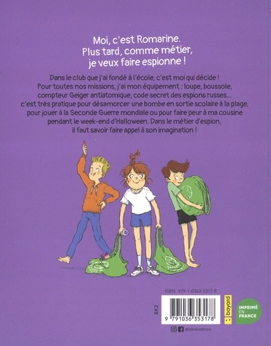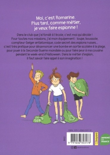 3 histoires de l'espionne en bande dessinée L'espionne sauve la planète Romarine et son club d'espionnage sont en sortie de classe. Objectif : nettoyer la plage. Mais Romarine et son club ont une autre mission pour sauver le monde : trouver la bombe nucléaire cachée sous le sable grâce à leur détecteur Geiger antiatomique. L'espionne frissonne Pour le week-end d'Halloween Romarine et ses parents vont rendre visite à Tatie Annick dans sa maison de campagne. Une poupée diabolique, un mystérieux message codé... Romarine et sa cousine jouent à se faire peur... L'espionne est occupée En écoutant un récit sur la Résistance, Romarine et son club décident également de se transformer en héros de la Résistance mettant en place de faux noms, faux papiers, un dossier secret...