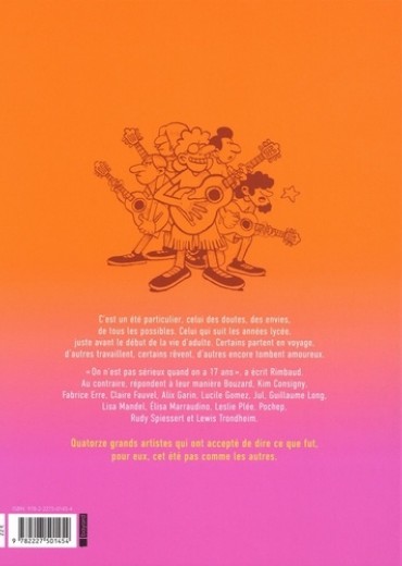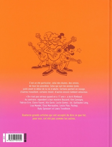 L'été de tous les possibles, celui de la fin du lycée et du début de la vie d'adulte, raconté par 14 auteurs qui se souviennent de leurs 17 ans. Lewis Trondheim se souvient de ses vacances en camping... l'origine de son pseudonyme ! Lisa Mandel, son job d'été en centre aéré, et la prise de conscience de son homosexualité. Bouzard, un été dans un abattoir, le pire boulot d'été. Leslie Plée, l'Espagne sans ses parents... l'été où elle s'est fâchée avec ses amis. Kim Consigny raconte son merveilleux voyage en famille en Ecosse... sans son amoureux, qui lui manque terriblement ! Rudy Spiessert, la découverte de son talent de dessinateur. Lucile Gomez, sa non-préparation pour la classe prépa, ses hésitations, son manque de confiance en elle. Fabrice Erre donne ses conseils pour (enfin) sortir avec une fille. Pochep, son job d'été en salle de sport et l'affirmation de son homosexualité. Jul, des vacances de rêves en Grèce avec ses amis, sans parents. Claire Fauvel, l'attente de la lettre qui dira ou non si elle est acceptée en école d'art. Guillaume Long, une vraie/fausse mononucléose et une relation amoureuse compliquée. Alix Garin, le voyage qu'elle a effectué en elle-même pour comprendre que le vide qu'elle ressentait était en fait la promesse de tous les possibles. Elisa Maraudino, un été dans sa famille italienne, le premier depuis la mort de son grand-père. "Ces petites histoires de jeunesse racontées dans des styles très différents, évoquent la nostalgie d'une époque, mais, surtout, rappellent que la jeunesse n'est pas un long fleuve tranquille", Anne Douhaire-Kerdoncuff, France Inter