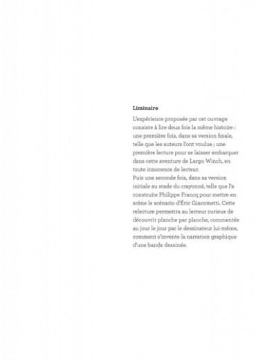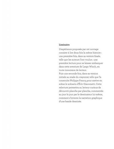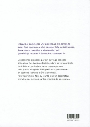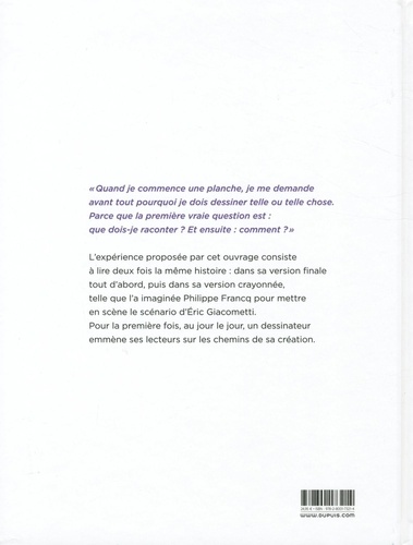 "Quand je commence une planche, je me demande avant tout pourquoi je dois dessiner telle ou telle chose. Parce que la première vraie question est : que dois-je raconter ? Et ensuite : comment ?" L'expérience proposée par cet ouvrage consiste à lire deux fois la même histoire : dans sa version finale tout d'abord, puis dans sa version crayonnée, telle que l'a imaginée Philippe Francq pour mettre en scène le scénario d'Eric Giacometti. Pour la première fois, au jour le jour, un dessinateur emmène ses lecteurs sur les chemins de sa création.