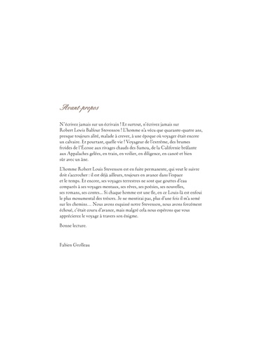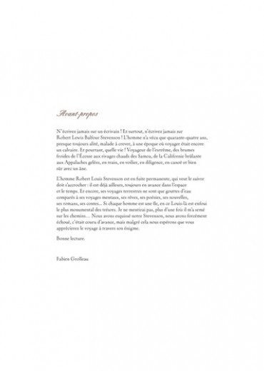 Romancier bien sûr, essayiste unanimement reconnu, grand voyageur, enfant puis adulte à la santé très fragile et l'imagination débordante, Robert Louis Stevenson est un des plus grands, sinon le plus grand écrivain de la fin du XIXe siècle. Admiré de ses contemporains et de ses successeurs, il n'aura eu de cesse d'écrire et de faire entrer la littérature dans la modernité, mêlant les genres, abolissant les frontières entre roman d'aventures ou " jeunesse " et " grande " littérature. Il meurt à seulement 44 ans, dans les îles Samoa, dernière étape de sa vie voyageuse.