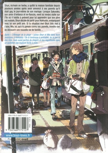 Shun, écrivain en herbe, a quitté la maison familiale depuis plusieurs années après avoir annoncé à ses parents qu'il était gay, le jour-même de son mariage. Lorsque Sakurako, son amie d'enfance et ex-fiancée, vient lui rendre visite sur l'île où il habite à présent pour lui apprendre que son père est malade, Shun décide de partir pour Hokkaido, embarquant avec lui son petit ami. Si la situation met Shun très mal à l'aise, Mio, lui, qui n'a jamais connu ses parents, semble ravi de découvrir une nouvelle vie de famille... Après " L'étranger de la plage " suivez Shun et Mio dans leurs aventures à Hokkaido ! de De la tendresse à profusion, de la joie et des rires, mais aussi parfois du chagrin et des inquiétudes dans un quotidien pas toujours facile à vivre.